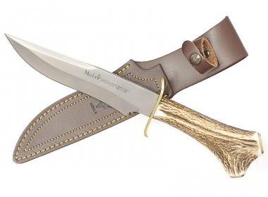 Elegantní nůž od španělské firmy Muela, ideální pro lov a pobyt v přírodě, Čepel je vyrobena z kvalitní molibden vanadiové oceli o tvrdosti 58 - 61 HRC. Ostří vybroušené do tvaru vlny dává noži skvělé řezné vlastnosti. Rukojet je vyrobena z parohu a velmi příjemně se drží. Na konci rukojeti bylo ponecháno rozšíření v místě kde se paroh rozdvojoval a oba výstupky jsou zakončeny mosaznou patkou, což noži dává osobitý vzhled. S nožem je dodáváno hnědé kožené pouzdrol.